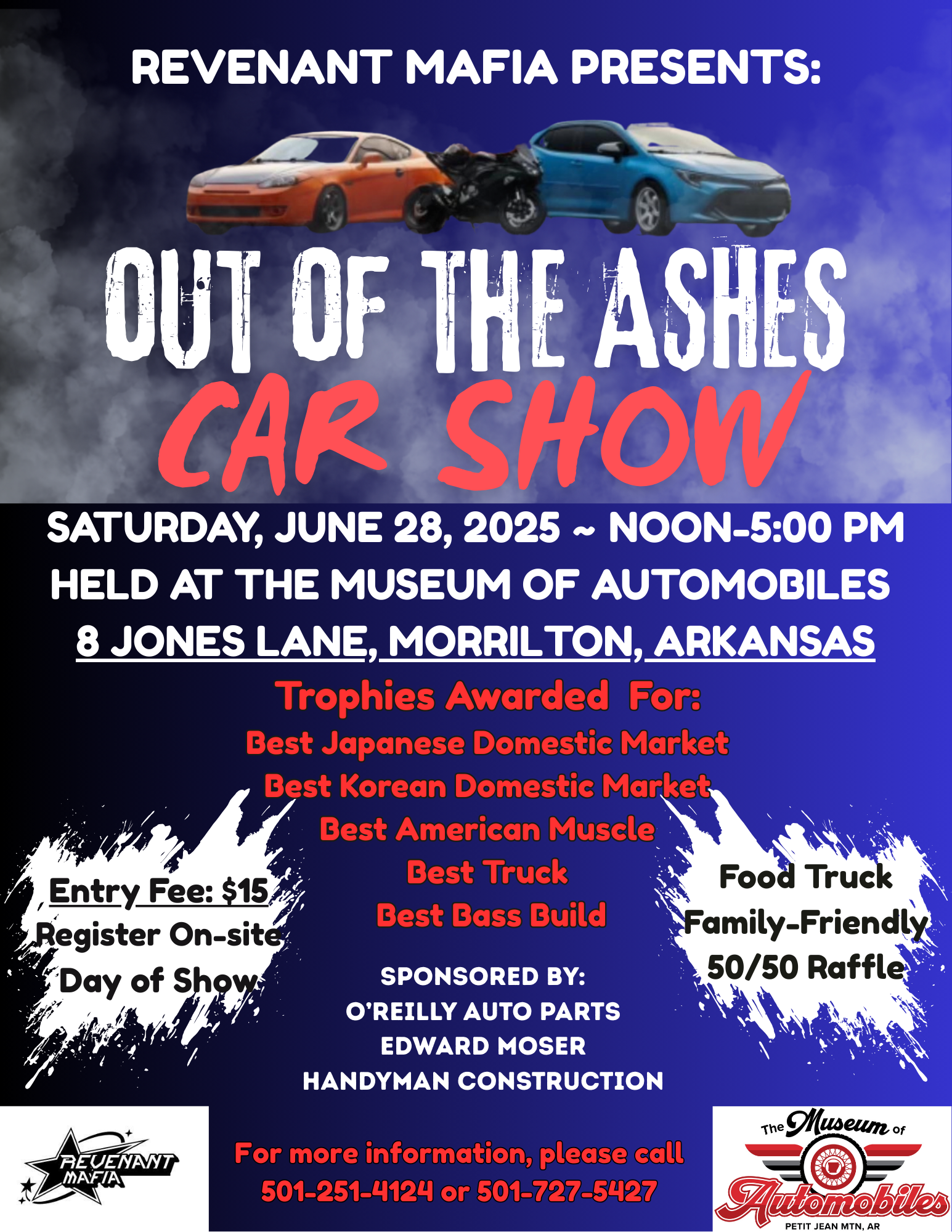Out of the Ashes Car Show- Hosted by Revenant Mafia Car Club and held on the grounds of the Museum of Automobiles on top of Petit Jean. Trophies will be awarded in the following categories: Best Japanese Domestic Market, Best Korean Domestic Market, Best American Muscle, Best Truck & Best Bass Build. Entry fee is $15 and registration will be done on-site morning of the show. Food truck on-site, family friendly, 50/50 raffle.