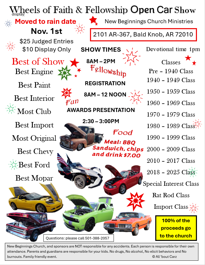 All ‘bout Carz, New Beginnings Church, and sponsors are NOT responsible for any accidents. Each person is responsible for their own attendance. Parents and guardians are responsible for your kids. No drugs, No alcohol, No elicit behaviors and No burnouts. Family friendly event. See less
