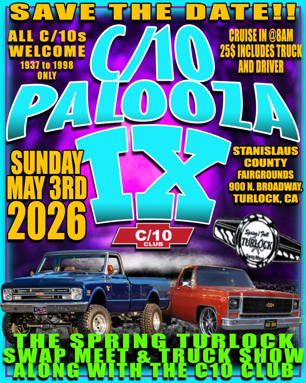 Our spring show is here with over 500 vendors and 300 C10 trucks at the C10 Palooza show. Gates open at 6am. Free parking is available. Come out and enjoy a great swap meet/car show!