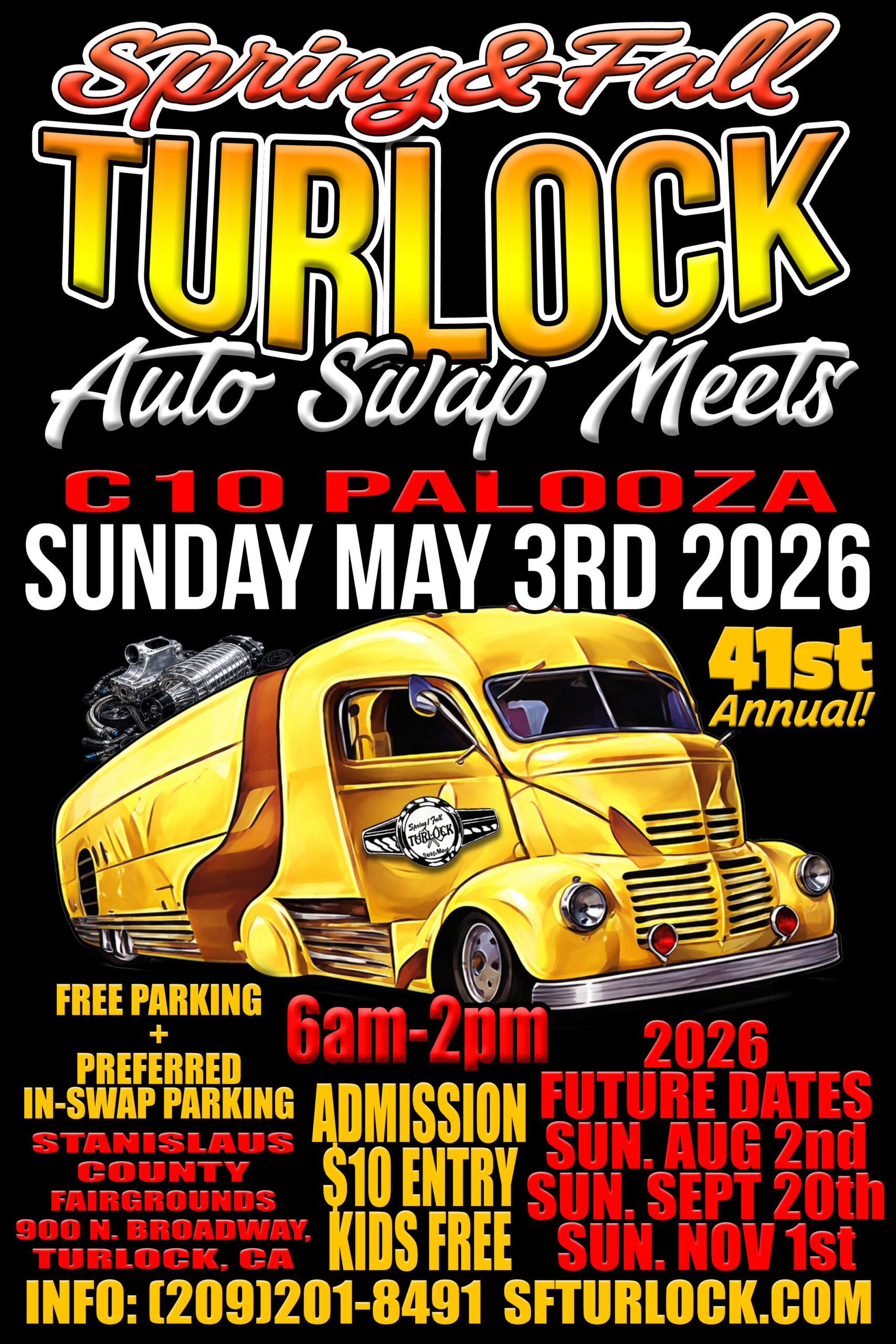 • public 2026-05-03 06:00:00 2026-05-03 14:00:00 America/Chicago Spring/Fall Turlock Swap Meet Spring/Fall Turlock Swap Meet will be held 5/3/2026 06:00 am to 5/3/2026 02:00 pm. Details online at: https://carshowradar.com/shows/ca/spring-fall-turlock-swap-meet/. Turlock, California