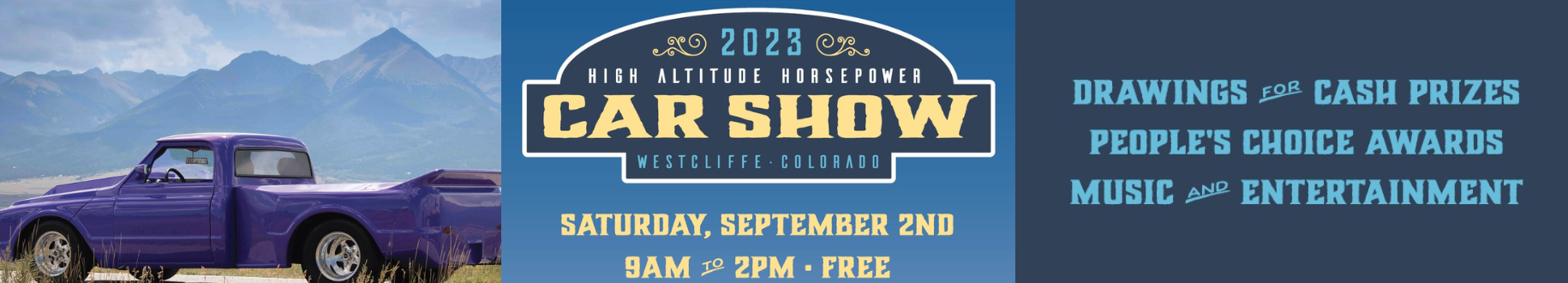 • public 2023-09-02 09:00:00 2023-09-02 14:00:00 America/Chicago High Altitude Horsepower Car Show in Westcliffe, CO High Altitude Horsepower Car Show in Westcliffe, CO will be held 9/2/2023 9:00 am to 9/2/2023 2:00 pm. Details online at: https://carshowradar.com/shows/co/high-altitude-horsepower-car-show-in-westcliffe-co/. Westcliffe, Colorado