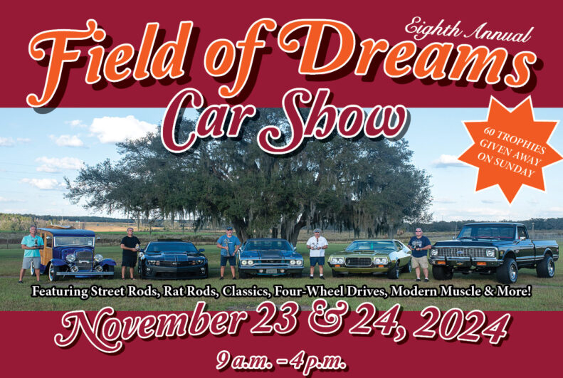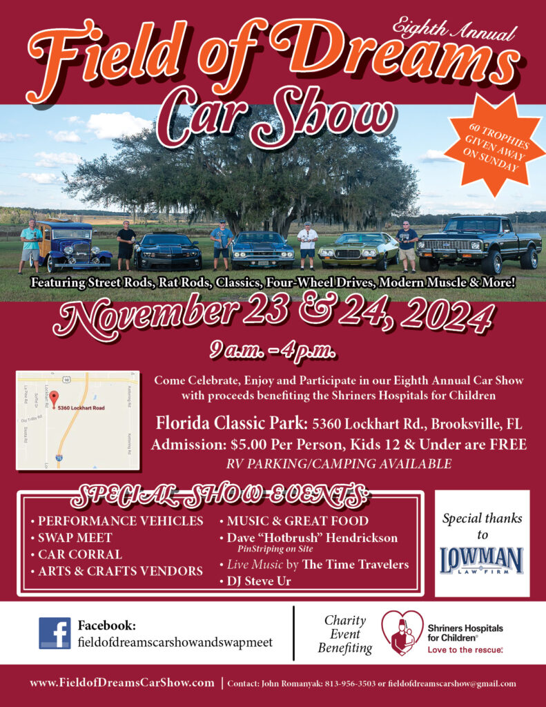 The Eighth Annual Field of Dreams Car Show will be held on November 23 & 24, 2024 at Florida Classic Park, 5360 Lockhart Rd., Brooksville, Fl. All proceeds will go to the Shriners Hospitals for Children. This is an open car show with all makes and models welcome. There will also be a swap meet, arts & crafts, food vendors, a DJ and live band. We will have a 50/50 drawing and lots of door prizes both days and judging will be on Sunday with 60 trophies/awards being awarded. Be sure to mark your calendars and come out and help support this most note-worthy cause. Show car registration is just $15.00 for the weekend if you pre-register before November 1, 2024. Swap meet and arts & crafts vendor spaces are just $25.00 if you register before November 1, 2024. You can register online at: fieldofdreamscarshow.com. See you at the show!