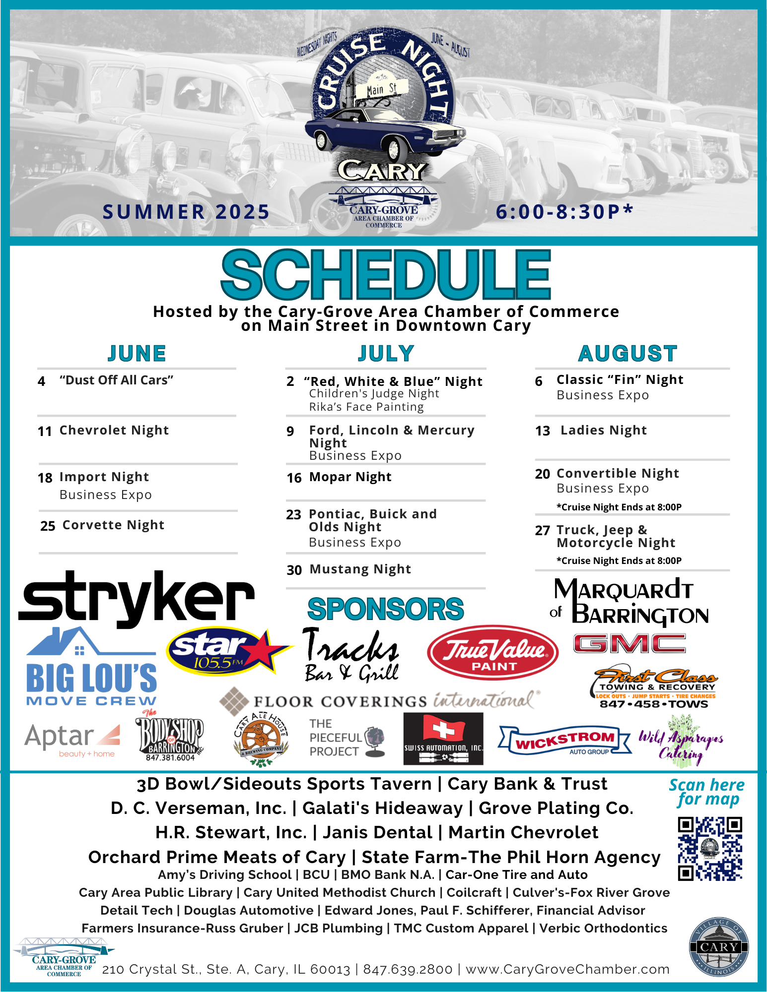 Join us every Wednesday evening from June 4 through August 27, 2025, as downtown Cary transforms into a vibrant showcase of automotive excellence and community spirit. As the longest-running car show in McHenry County, Cary Cruise Nights offers themed displays, music, and family-friendly activities, all set against the backdrop of our newly revitalized Main Street. This milestone 27th season underscores our commitment to fostering community engagement and supporting local businesses. We invite enthusiasts and families alike to experience the charm and camaraderie that define Cary Cruise Nights. For weekly themes and updates, visit CaryGroveChamber.com or follow us on Facebook @CaryCruiseNight