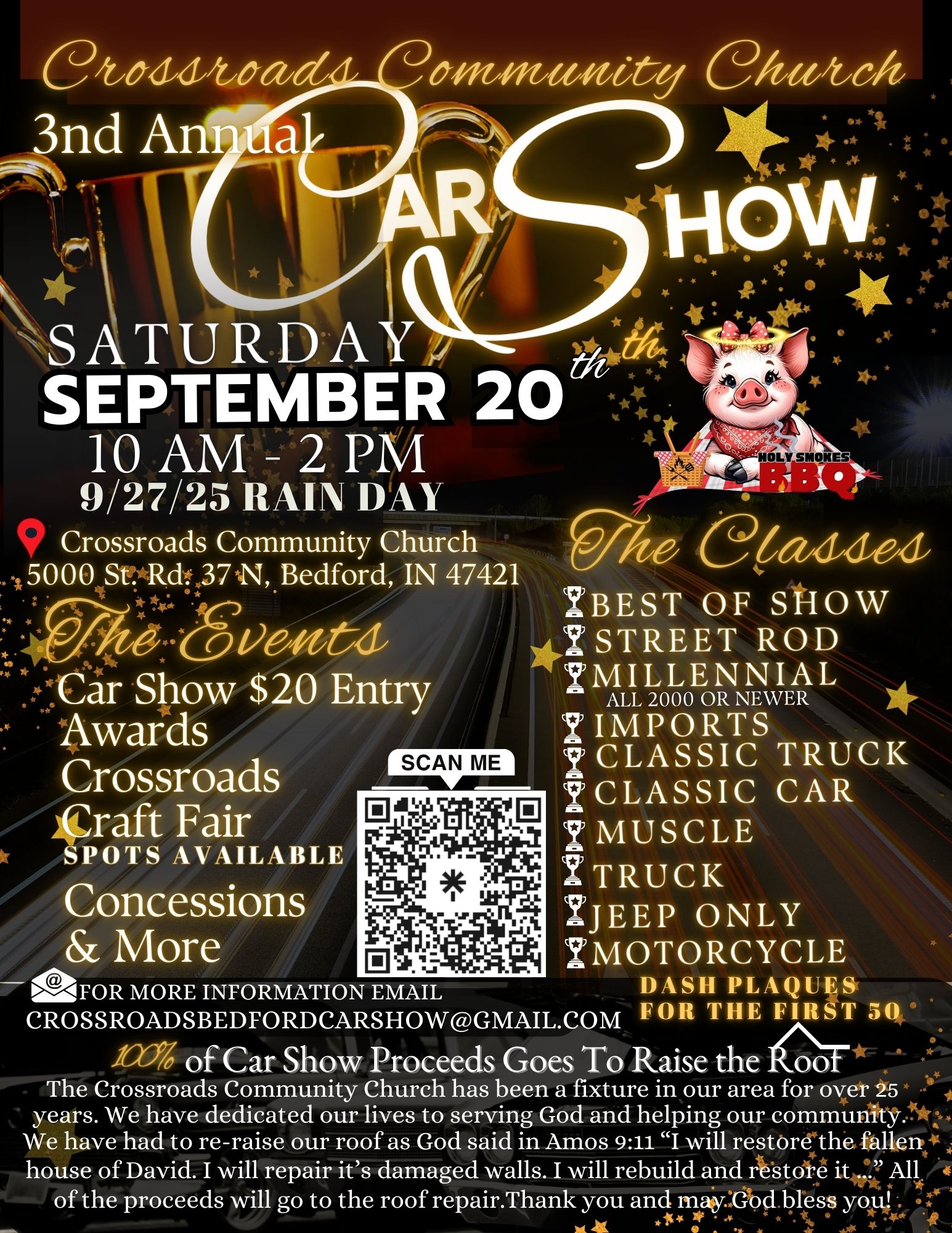 September 20, 2025 -(Bedford, IN 47421) Crossroads Community Church 3rd annual carshow.