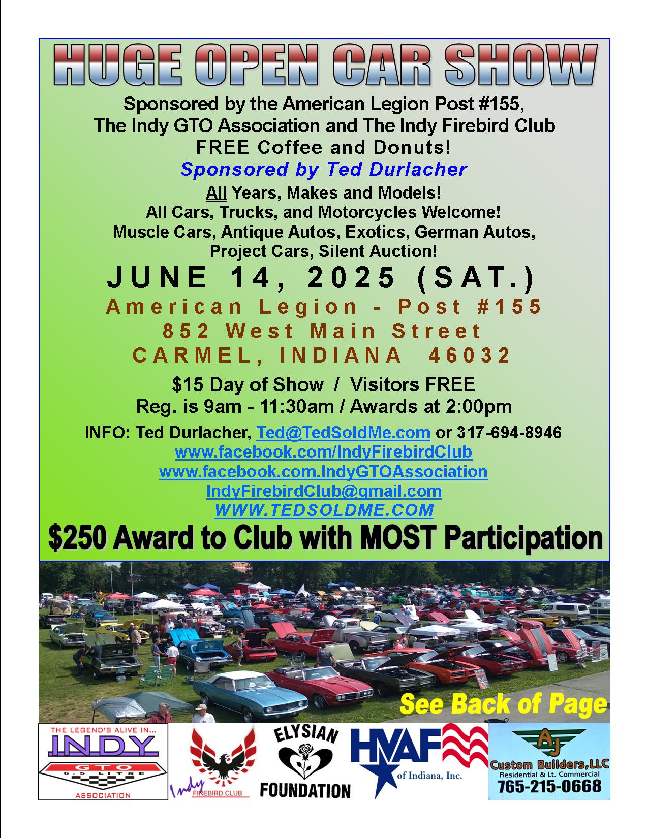Sponsored by the Carmel American Legion Post #155, The Indy Firebird Club and the Indy GTO Association. This show is a fund raiser for HVAF (Helping Veterans And Families) and the Elysian Foundation.