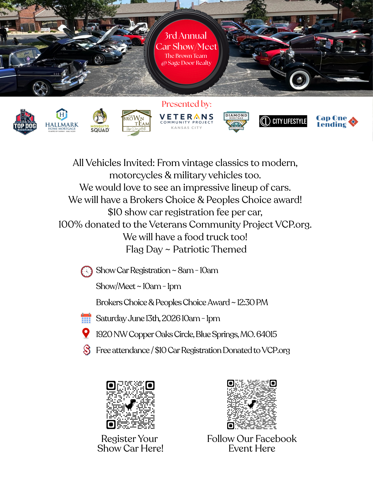 $10 show car registration fee per car, 100% donated to the Veterans Community Project VCP.org.