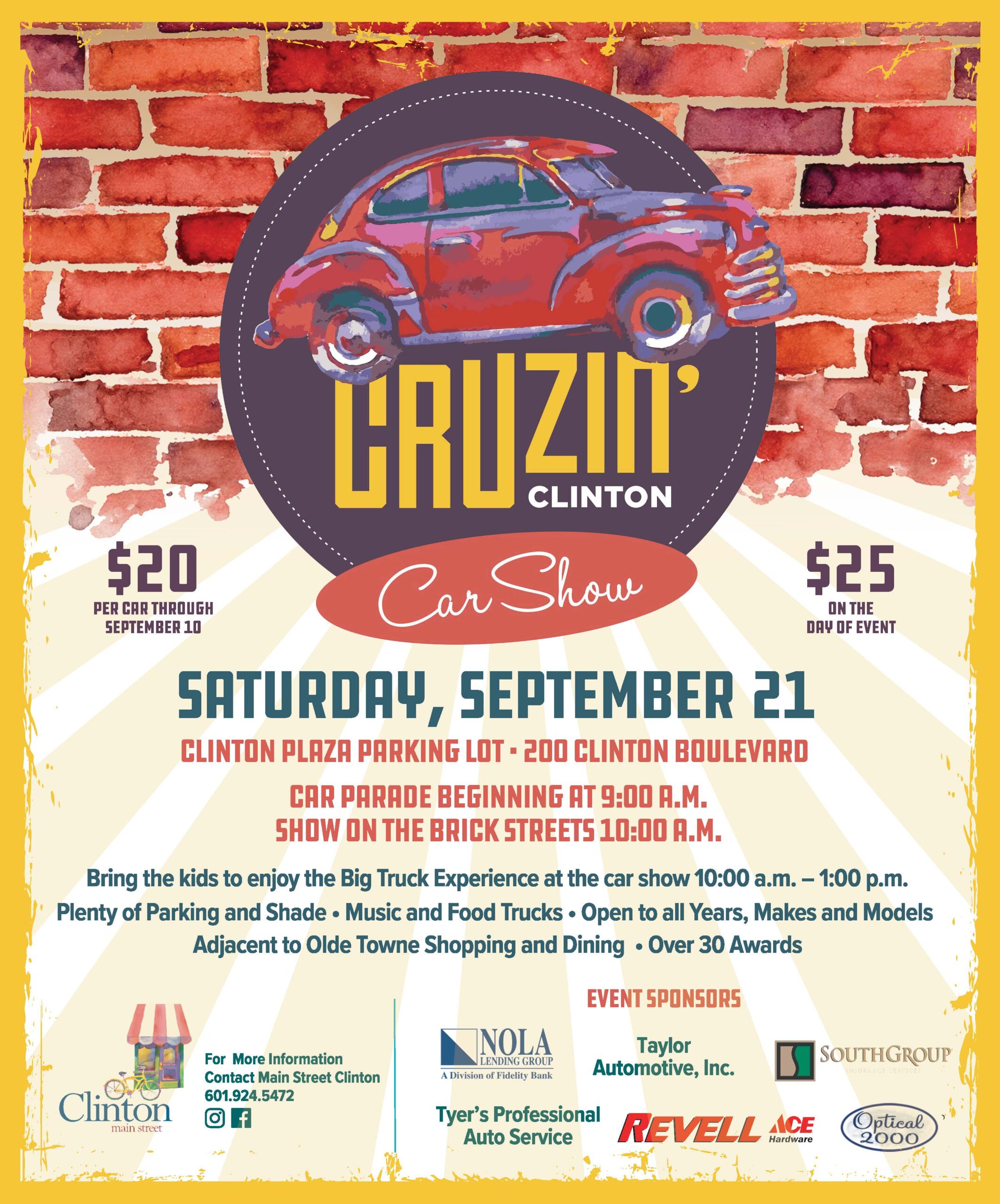 • public 2024-09-21 09:00:00 2024-09-21 14:00:00 America/Chicago Cruzin’ Clinton Car Show Cruzin’ Clinton Car Show will be held 9/21/2024 09:00 am to 9/21/2024 02:00 pm. Details online at: https://carshowradar.com/shows/ms/cruzin-clinton-car-show/. Clinton, Mississippi