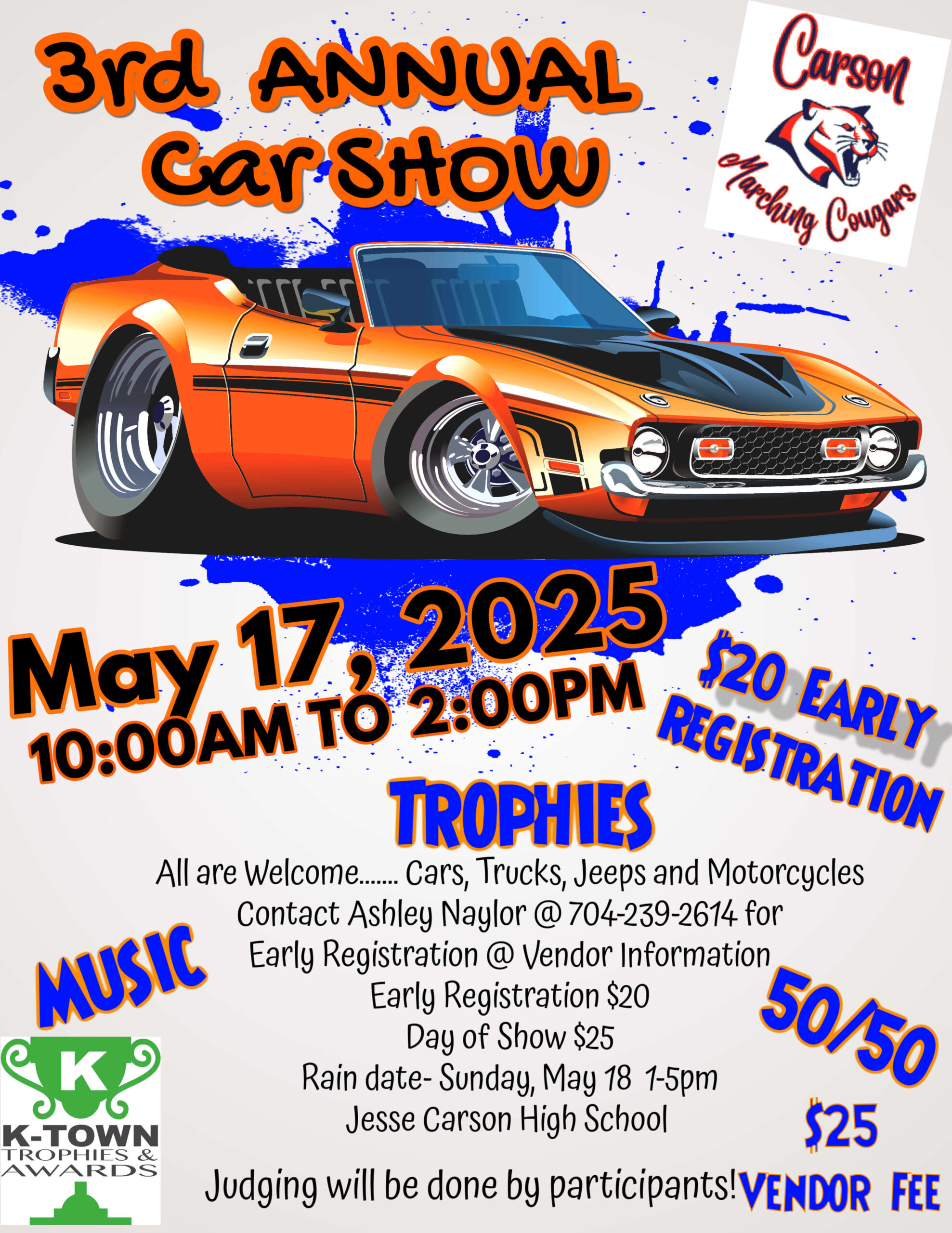 Hello friends! Carson Marching Band is having their third annual car show on May 17th to raise money for new uniforms, instrument repair, travel, etc. We know the Cheerwine Festival will also be that day, but our show will only be between 10am and 2pm, so you could do potentially both . Please reach out to Ashley Naylor at 704-239-2614 or naylorashley86@gmail.com if you would like to support the arts and our amazing, hardworking marching band kids! Early car entry/registration fee is $20 and will be $25 if you register the day of the event. Categories will include best in class (muscle, modern, classic, antique, truck, motorcycle, and jeep), best in show, band favorite, most likely to be impounded, and most likely to be in a police pursuit. We are also seeking vendors. Vendor fee is $25. Rain date is 5/18/2025. Address is 290 Kress Venture Dr, China Grove, NC 28023.
