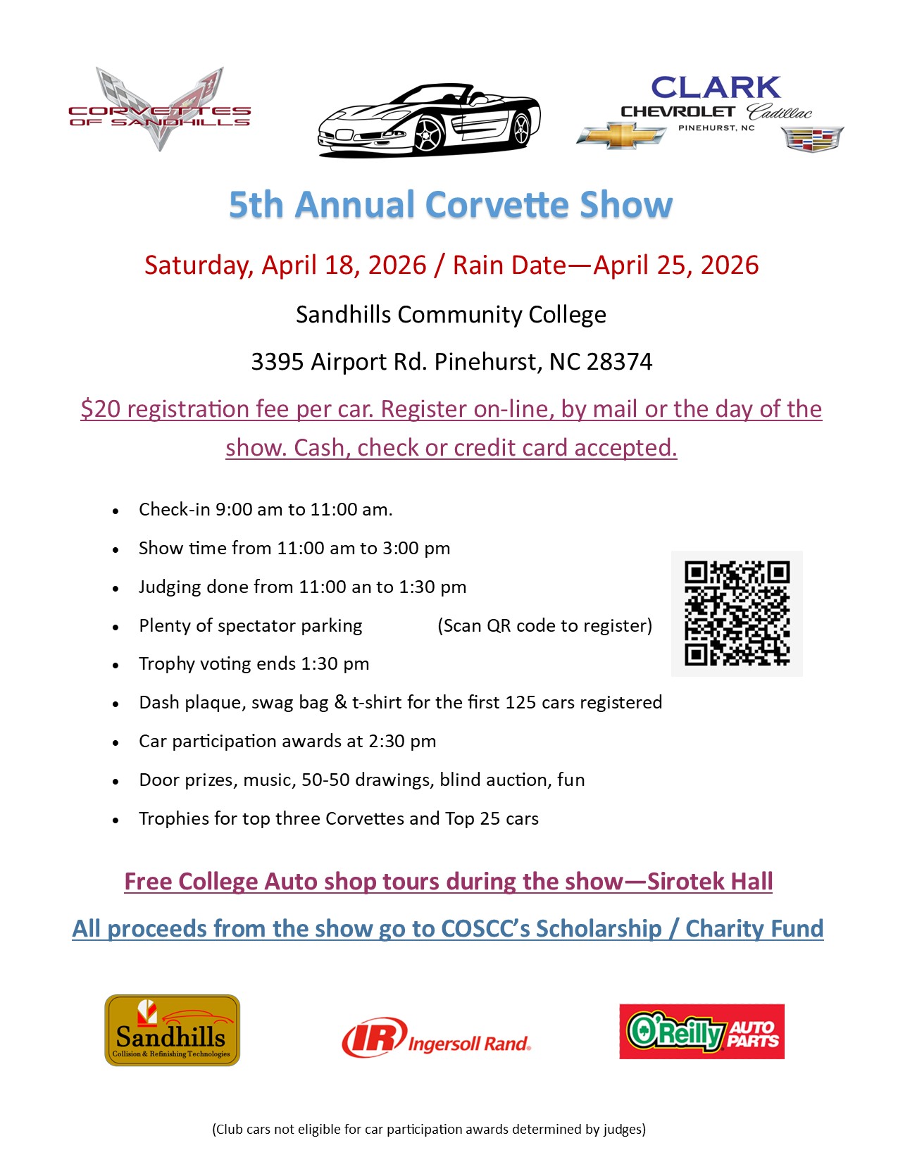 The 5th Annual COSCC Corvette Show is coming on April 18, 2026. As in the past, the show will be held on the beautiful grounds of Sandhills Community College in Pinehurst, NC. Make your plans now to be in attendance for what I believe will be our best show yet. A lot of new surprises are in the works to help you get your fix of automotive information. Along with the Corvette show, there will be an all-mark cruise-in on the adjacent property. There will be 50-50 drawing, Blind Auction, door prizes, music, Trophies for top 3 Corvettes and top 25 cars and Lots of Fun for all!