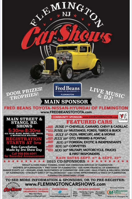 Thank you to our 2025 Main Car Show Sponsor the Fred Beans Toyota-Nisson-Hyundai Team of Flemington and Co-Sponsors Wright and Ford Funeral Home of Flemington and Max Fitness and Wellness Center.
