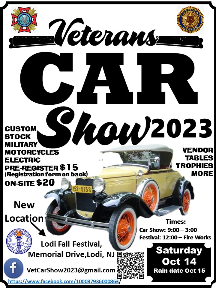 • public 2023-10-21 09:00:00 2023-10-21 15:00:00 America/Chicago Veterans Car Show 2023 Veterans Car Show 2023 will be held 10/21/2023 09:00 am to 10/21/2023 03:00 pm. Details online at: https://carshowradar.com/shows/nj/veterans-car-show-2023/. Lodi, New Jersey