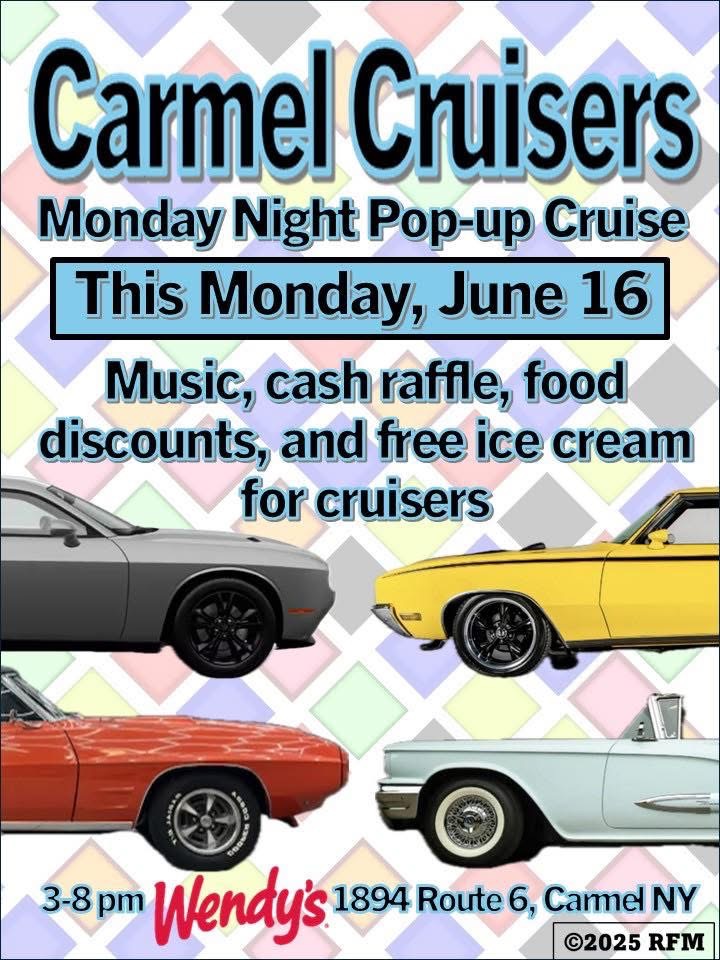 • public 2025-06-23 16:00:00 2025-06-23 20:00:00 America/Chicago Carmel Cruisers Monday Night Cruise ! Carmel Cruisers Monday Night Cruise ! will be held 6/23/2025 4:00pm to 6/23/2025 8:00pm. Details online at: https://carshowradar.com/shows/ny/carmel-cruisers-monday-night-cruise/. Carmel, New York