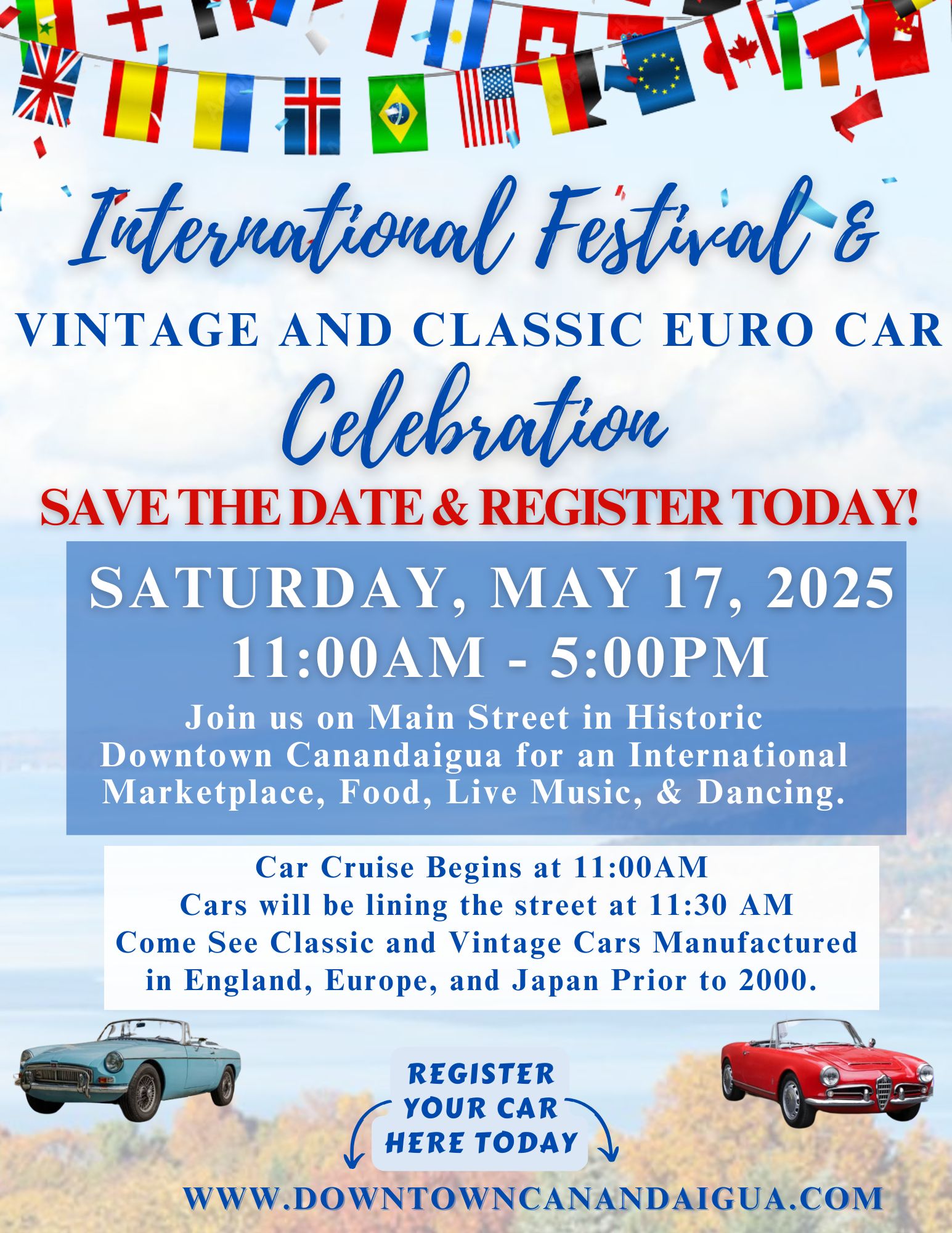 The 3rd annual Downtown Canandaigua International Festival and Car Show will take place Saturday May 17th, 2025. The show is open to all cars made in Europe, the U.K., Asia, or anywhere outside the U.S. before 2000. As in past years, the opening car tour (with police escort this year) will cruise past several senior living facilities before display parking on Main Street. There will be dash plaques, goodie bags, and people’s choice awards in several categories. The International Festival will include music, food, and displays from many countries. There will be activities for the entire family including race car painting and free smoothies for children. Information and registration can be found at www.downtowncanandaigua.com. You can also contact Rob Lillis at roblilliseval@gmail.com.