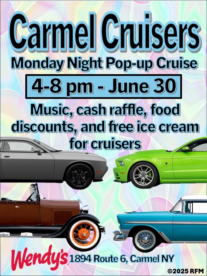 • public 2025-06-30 16:00:00 2025-06-30 20:00:00 America/Chicago Wendy’s Carmel Cruisers Monday Night Cruise Wendy’s Carmel Cruisers Monday Night Cruise will be held 6/30/2025 4:00pm to 6/30/2025 8:00pm. Details online at: https://carshowradar.com/shows/ny/wendys-carmel-cruisers-monday-night-cruise/. Carmel, New York