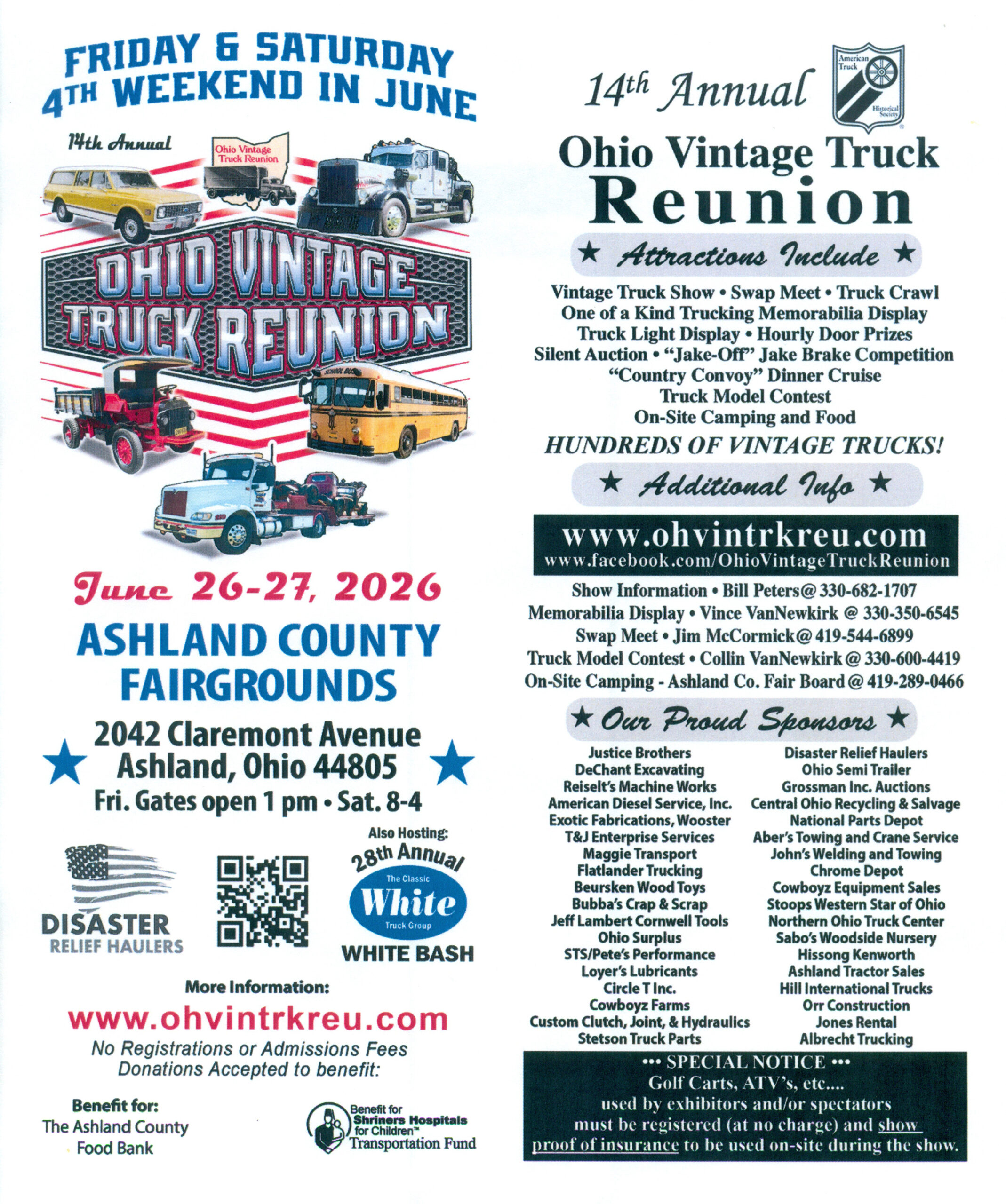 14th Annual Ohio Vintage Truck Reunion, Ashland, OH – Ashland County Fairgrounds, 2042 Claremont Avenue, Ashland, OH 44805 Fri. June 26 – Sat. June 27, 2026 Hosted by the Ohio Chapters of the American Truck Historical Society. Show Hours 1-6 Fri., 9am to 4pm Sat. Hundreds of Vintage Trucks, Huge Trucking Memorabilia Display, Swap Meet, On-Site Camping with RV Hookups available. Truck Crawl, Jake-Off, Light Show, Truck Model Contest, Truck Swap Meet, Country Convoy, and More!