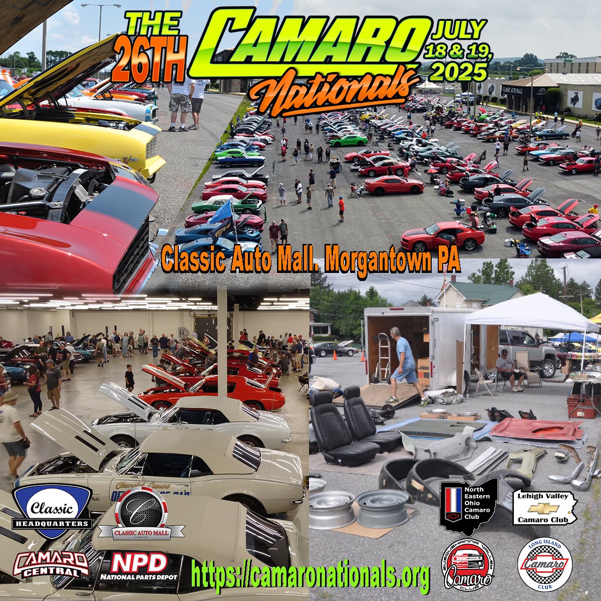 There is plenty to keep you busy…..a Kick Off Cruise, indoor and outdoor displays of Camaros, 5 levels of judging, 2 banquets, a silent and a live Charity Auction, parts vendors, evening parking lot parties, a casino, antique shopping, Shady Maple Smorgasbord, and great friends.
