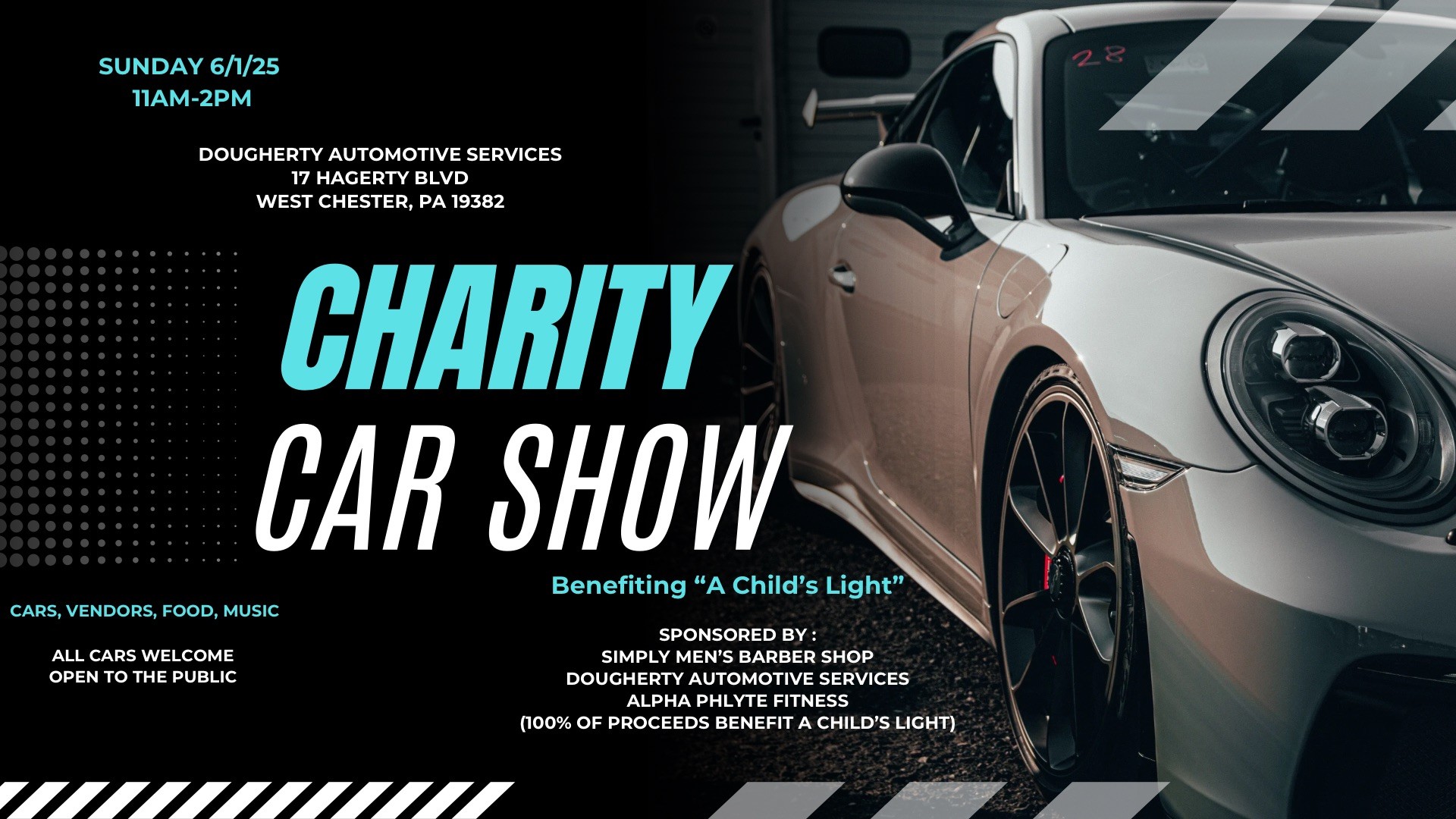 Simply Men’s Barber Shop, Dougherty Automotive Services and Alpha Phlyte Fitness have collaborated to host our 4th charity car show. There will be cars, vendors, Food Truck, live music and more. Proceeds will benefit “A Child’s Light”. Come show off your car or be a spectator. We are looking forward to seeing you all there!