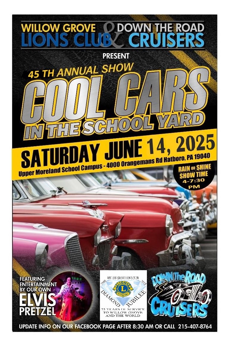 The Willow Grove Lions Club and the Down the Road Cruisers Club present the 45th Annual show. Registration opens 2:30 PM, show time 4:00-7:00 PM. Day of show registration $20.00. We will be hosting the first-ever Volunteer Fair, a showcase of local Non-Profit organizations who strive for the betterment of Upper Moreland Township. Stroll the cars, then stroll into the Intermediate School building to meet and greet the volunteers and learn what they do to help make Upper Moreland a better place to live, work and shop in.