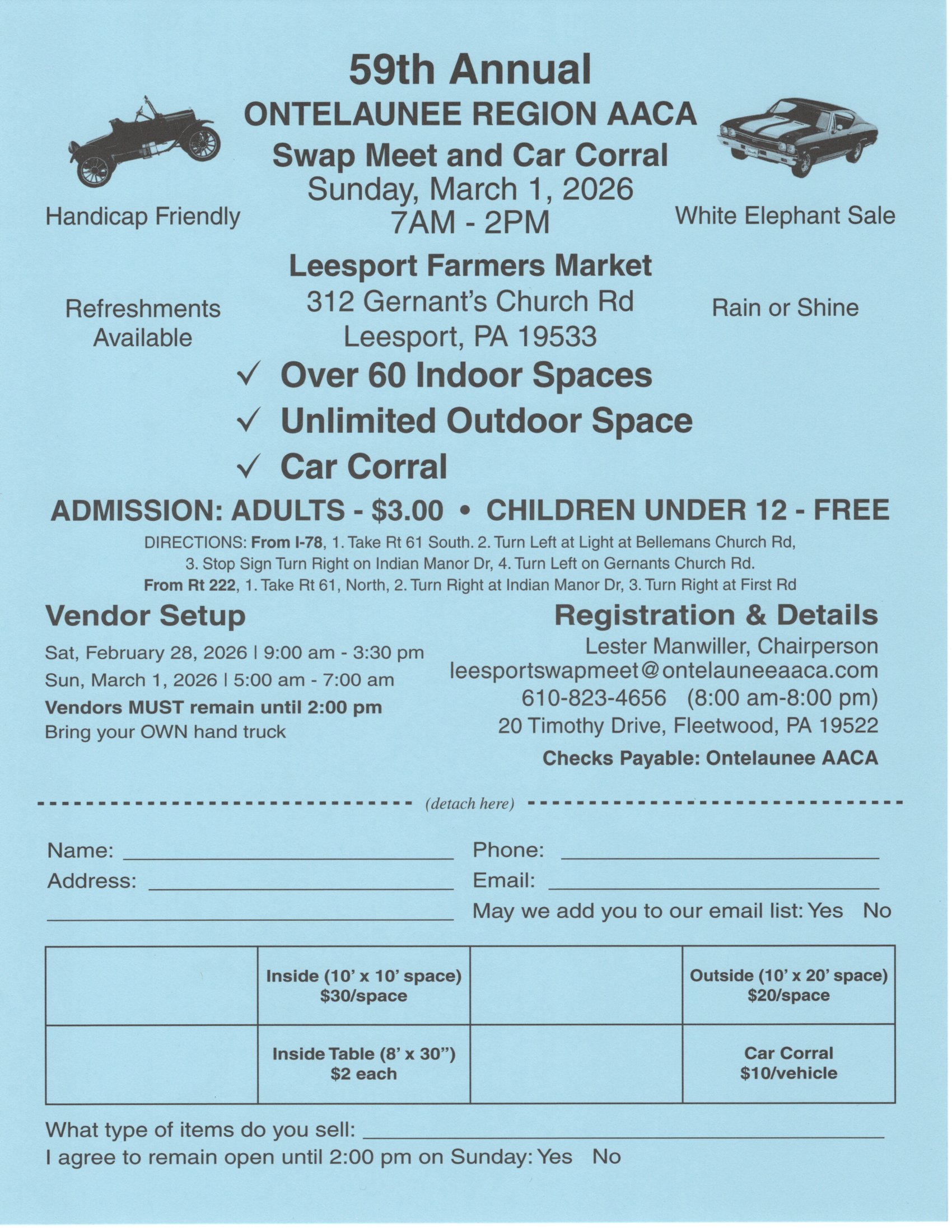 Automotive Swap Meet & Car Corral with over 60 indoor spaces and unlimited outdoor vendor spaces. Held rain or shine. Refreshments available. Handicap Friendly. Large assortment of white elephant items. For information email leesportswapmeet@ontelauneeaaca.com or call 610-823-4656.