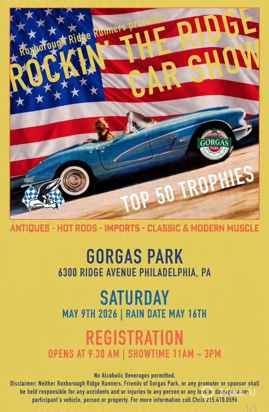 The Roxborough Ridge Runners invite you to join us for our annual Rockin’ the Ridge Car Show on Saturday, May 9th. Rain date Saturday, May 16th. Registration opens 9:30 AM, show time 11:00 AM-3:00 PM. Registration $20.00 day of show only. See our show poster or visit www.roxrigrun.org for complete details.