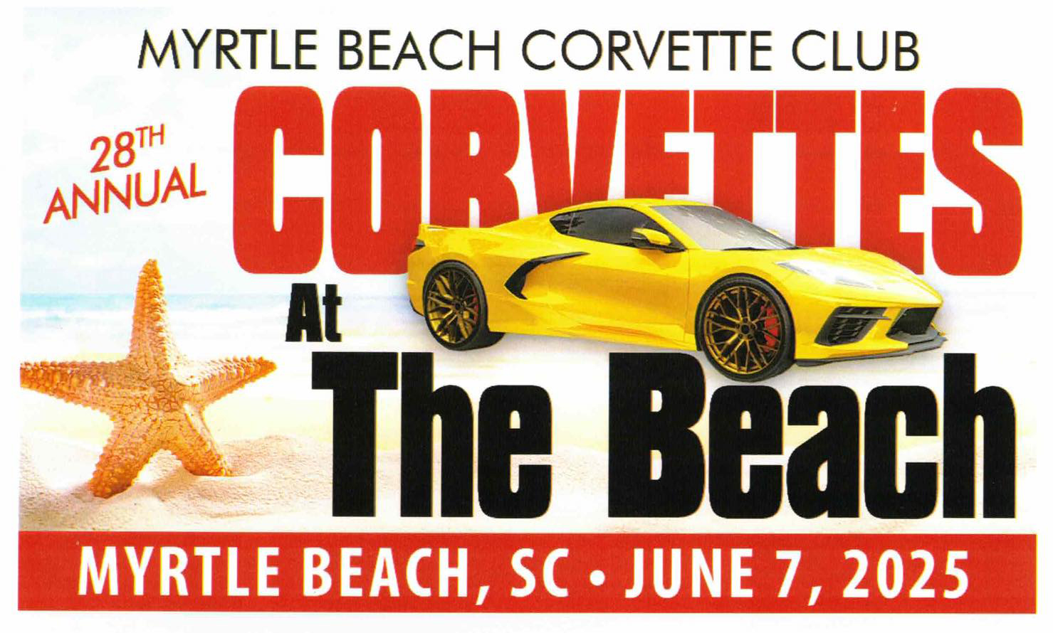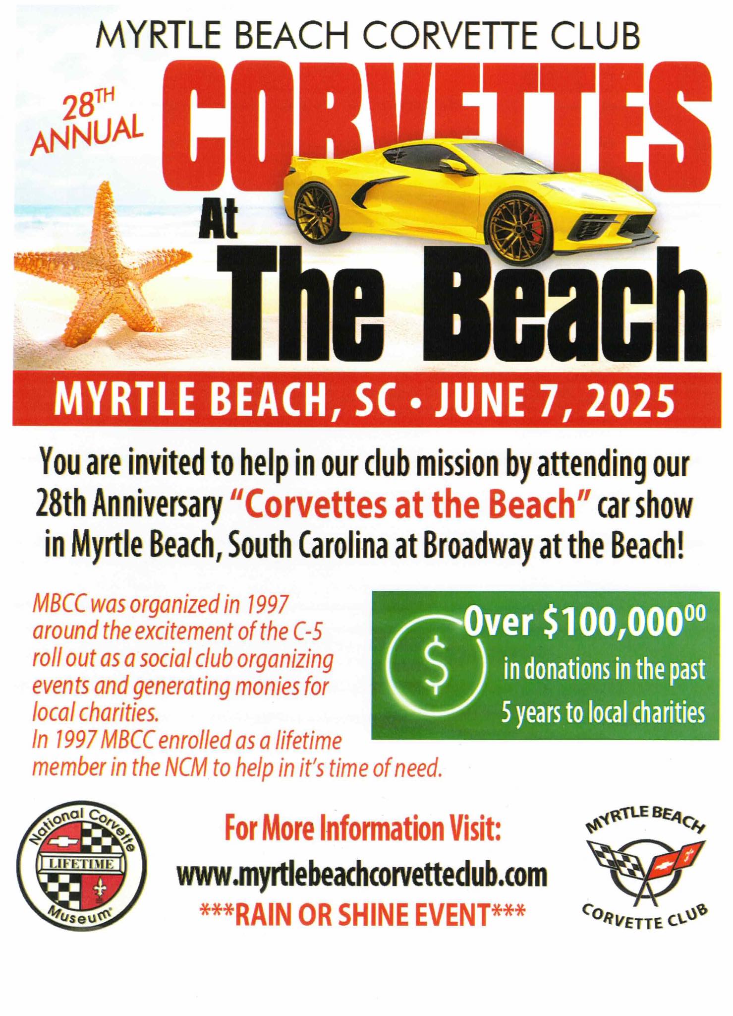 You are invited to help in our club mission by attending our 28th Anniversary “Corvettes at the Beach” car show in Myrtle Beach, South Carolina at Broadway Beach!