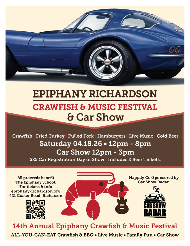 The Annual Crawfish & Music Festival is back— and it’s bigger, tastier, and more fun than ever! Gather your friends, bring the whole family, and come hungry for a full day of incredible food, live music, at this unforgettable community celebration. 2026 brings a new time, the return of the car show and new family friendly pricing options! Join us Saturday, April 18th from noon – 8:00 p.m. at the Episcopal Church of the Epiphany, 421 Custer Road in Richardson, TX.