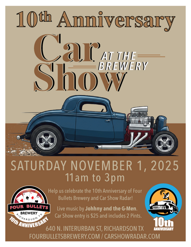 • public 2025-11-01 11:00:00 2025-11-01 15:00:00 America/Chicago 10th Anniversary Car Show at the Brewery! 10th Anniversary Car Show at the Brewery! will be held 11/1/2025 11:00 am to 11/1/2025 03:00 pm. Details online at: https://carshowradar.com/shows/tx/10th-anniversary-car-show-at-the-brewery/. Richardson, Texas