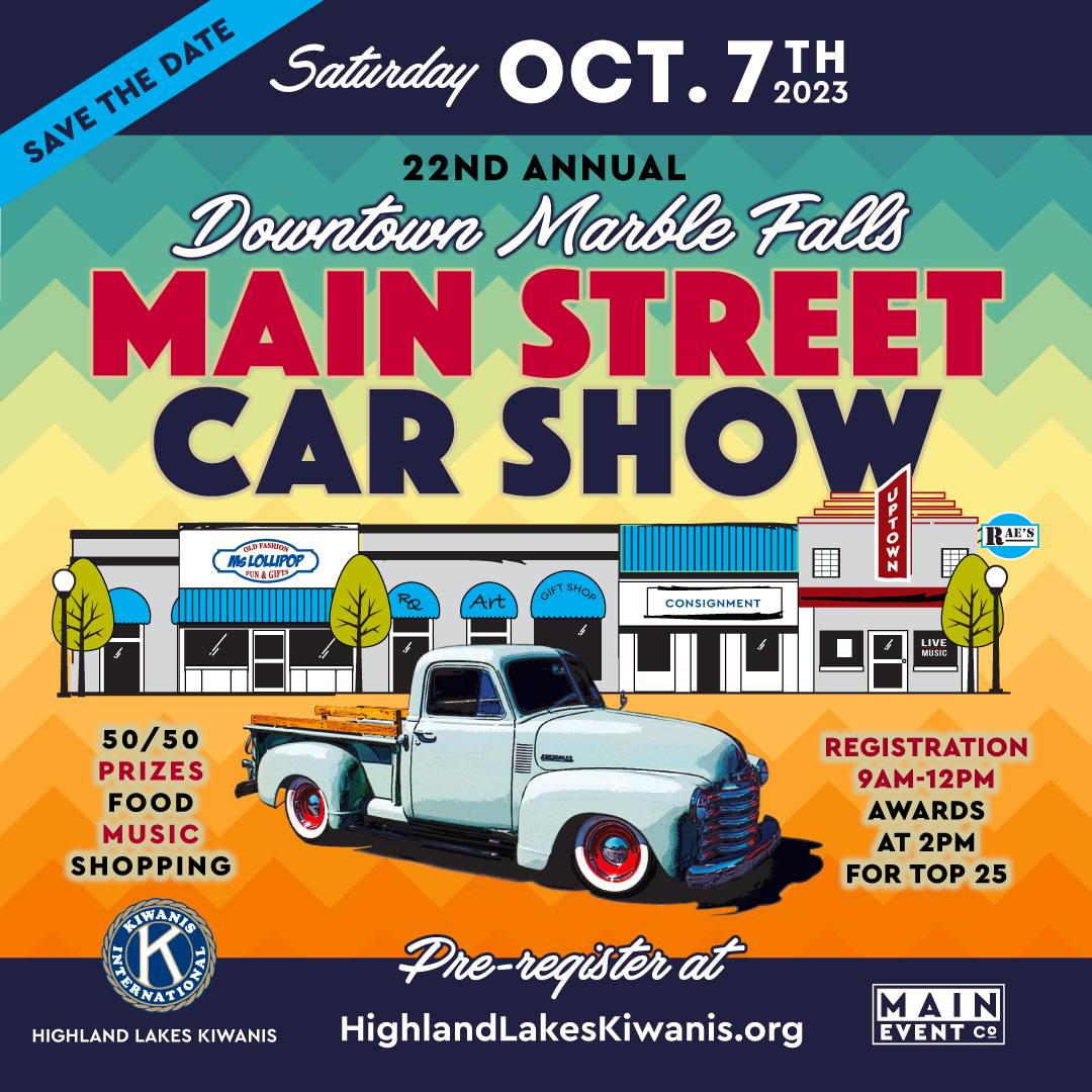 • public 2023-10-07 09:00:00 2023-10-07 14:00:00 America/Chicago 22nd Annual Marble Falls Main Street Car Show 22nd Annual Marble Falls Main Street Car Show will be held 10/7/2023 9:00 am to 10/7/2023 02:00 pm. Details online at: https://carshowradar.com/shows/tx/22nd-annual-marble-falls-main-street-car-show/. Marble Falls, Texas