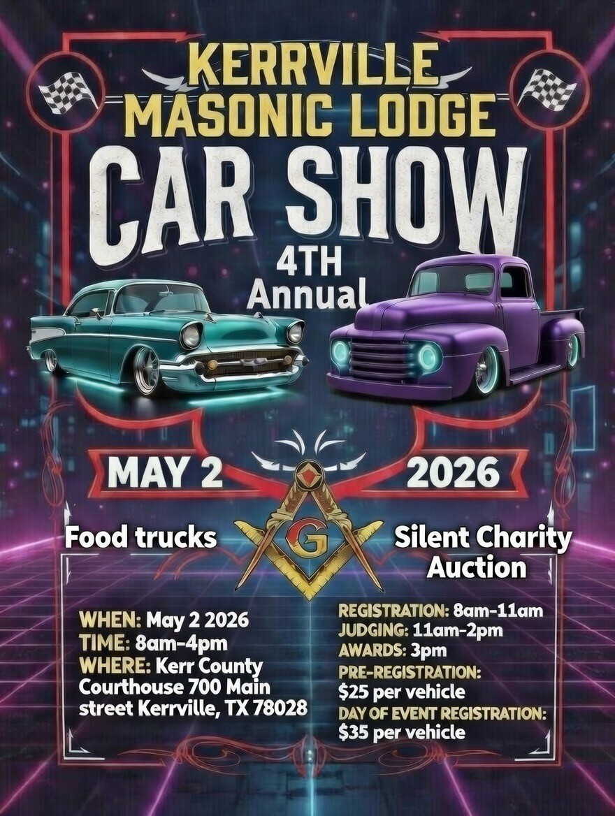 • public 2026-05-02 08:00:00 2026-05-02 16:00:00 America/Chicago 4th Annual Kerrville Masonic Lodge Charity Car Show 4th Annual Kerrville Masonic Lodge Charity Car Show will be held 5/2/2026 08:00 am to 5/2/2026 04:00 pm. Details online at: https://carshowradar.com/shows/tx/4th-annual-kerrville-masonic-lodge-charity-car-show/. Kerrville, Texas