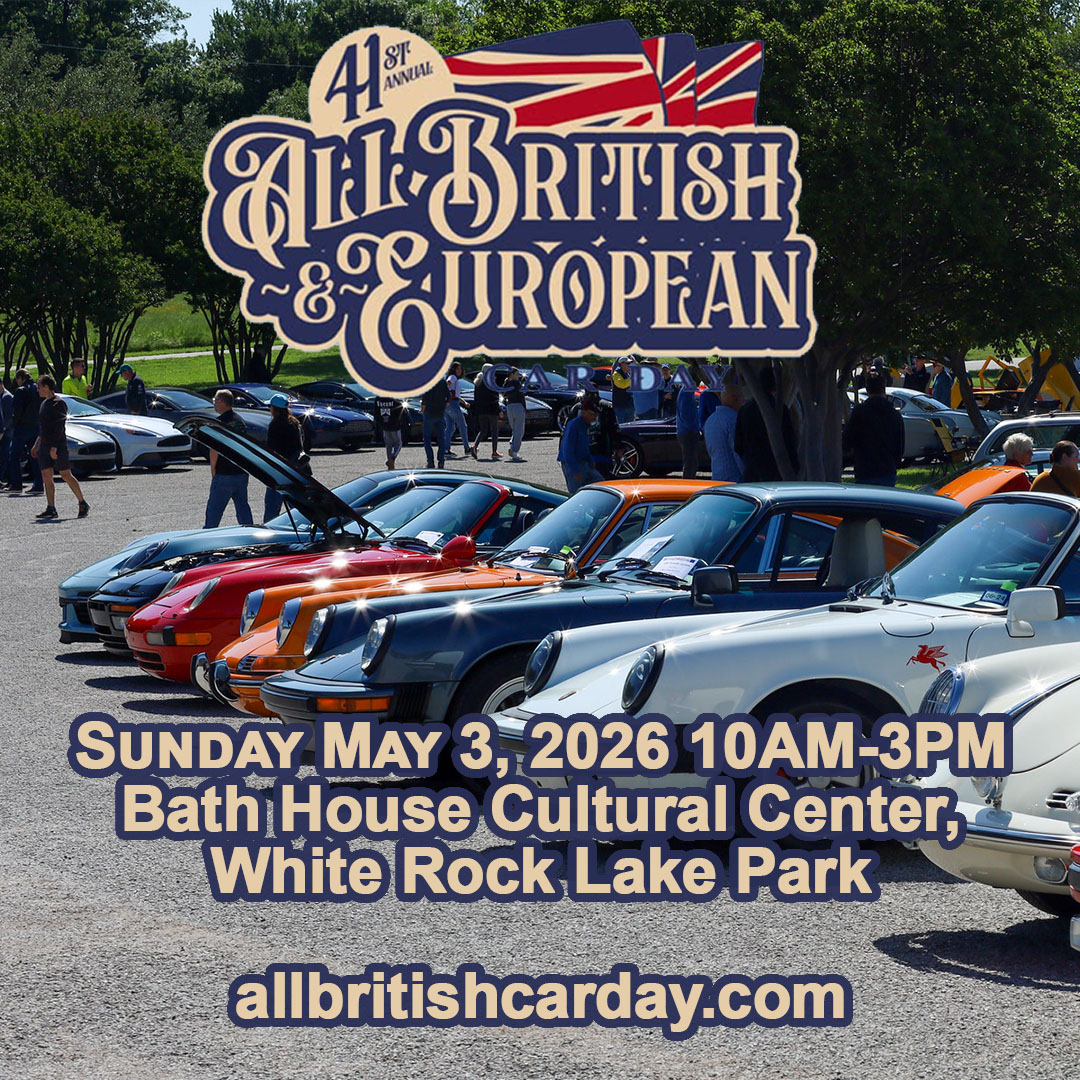 Join us for the 41th Anniversary of fine British & European motoring at the Cultural Bath House, White Rock Lake Park, Dallas, Texas on Sunday, May 03, 2026. Bring any British or European car or motorbike, driver or show vehicle to compete for trophies determined by popular voting.