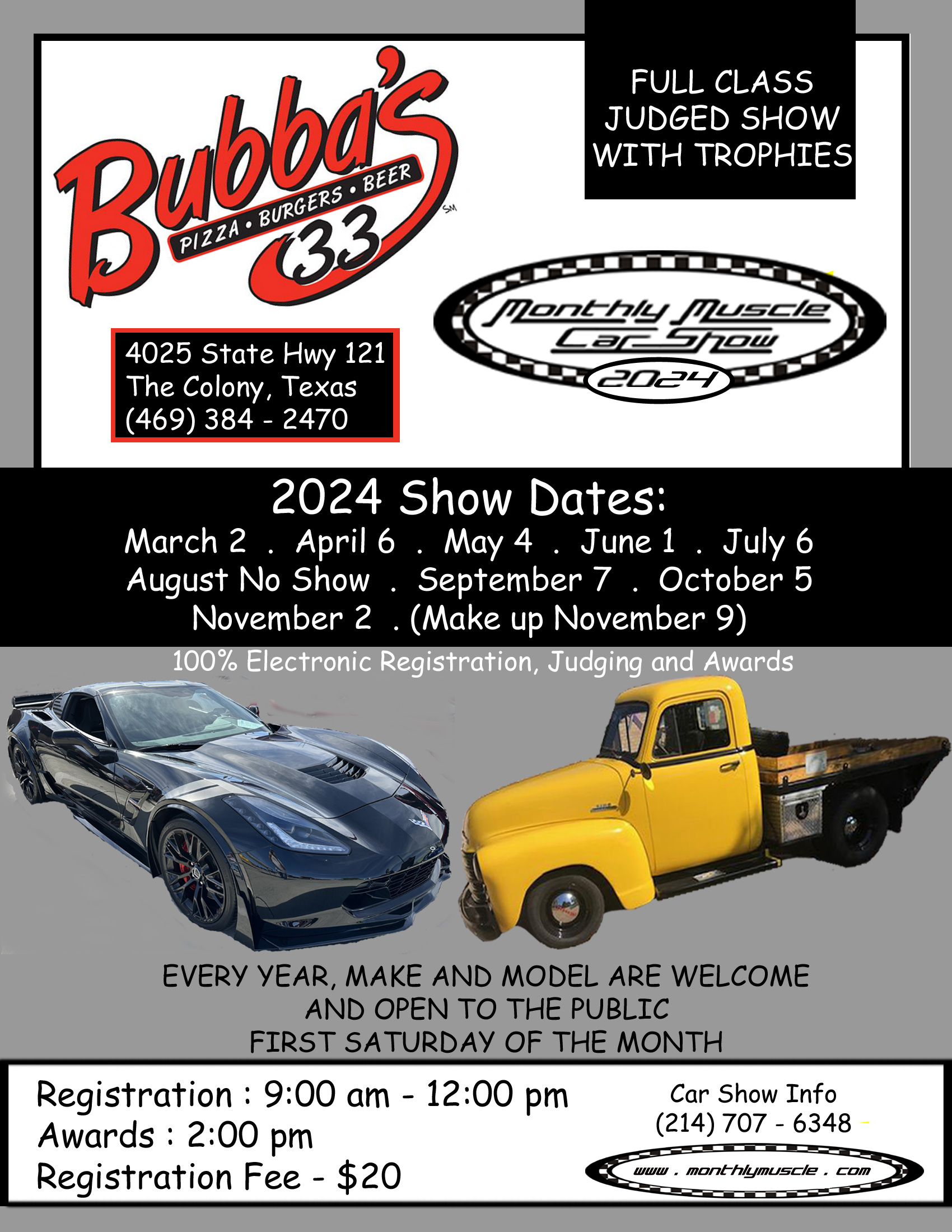 Be sure to mark your calendars for Bubba’s 33 Car and Truck show. The next show will be held October 5th, hosted by Monthly Muscle Car Shows, starting at 9:00am with the awards at 2:00pm. Located at 4025 Hwy 121, The Colony, Texas 75056. FULL CLASS JUDGED SHOW, OPEN TO ALL MAKES AND MODELS! Share this with family and friends! Come out and have a great day with Bubba’s 33 (burger and onion rings (delicious!), pizza, chicken wings and more) and Monthly Muscle Car Shows!
