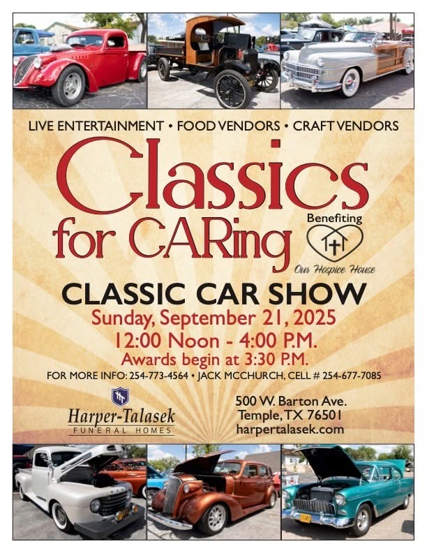 Rev up your engines and mark your calendars for Sunday, September 21, 2025, 12pm-4pm, as we bring the community together for the Classics for CARing Car Show, a fun-filled, family-friendly event to support Our Hospice House of Temple. Hosted at Harper-Talasek Funeral Home (500 West Barton Avenue, Temple, Texas), this exciting day will showcase an incredible lineup of vintage, classic, and cool cars, plus a special appearance by both an antique and a modern firetruck!