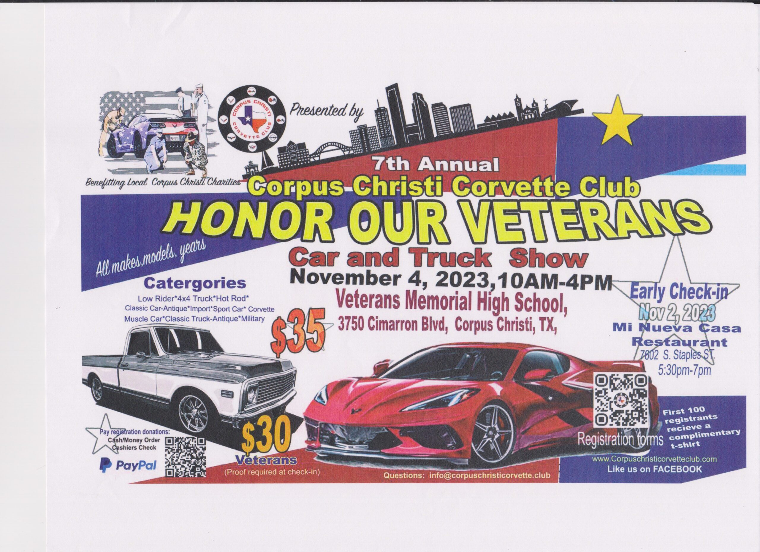 $30 Veterans & $35 Non Veterans Use flyer Qr code or contact with questions info@corpuschristicorvette.club