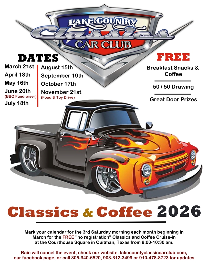 Mark your calendar for the 3rd Saturday morning each month beginning in March for the FREE “no registration” Classics and Coffee Cruise-In at the Courthouse Square in Quitman, Texas from 8:00-10:30am.
