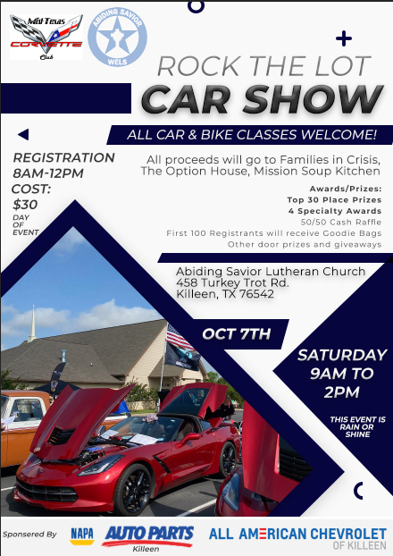 Join us for a great car show put on by the Mid-Texas Corvette Club! All car and bike classes are welcome and all proceeds will go to the Families in Crisis, the Option House and Mission Soup Kitchen.
