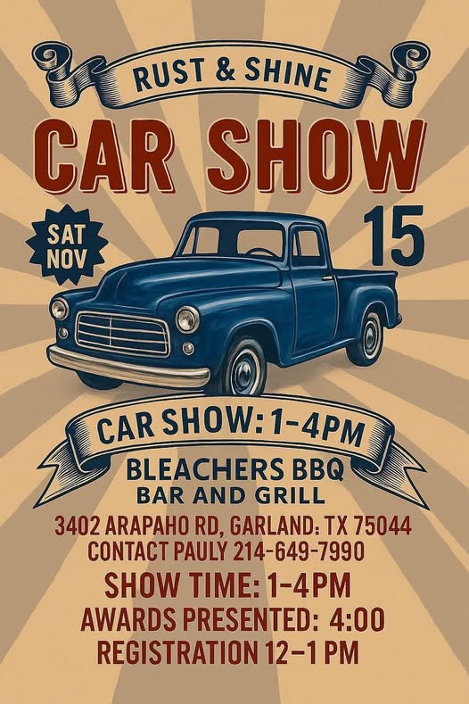 • public 2025-11-15 13:00:00 2025-11-15 16:00:00 America/Chicago Rust & Shine Car Show Rust & Shine Car Show will be held 11/15/2025 01:00 pm to 11/15/2025 04:00 pm. Details online at: https://carshowradar.com/shows/tx/rust-shine-car-show/. Garland, Texas