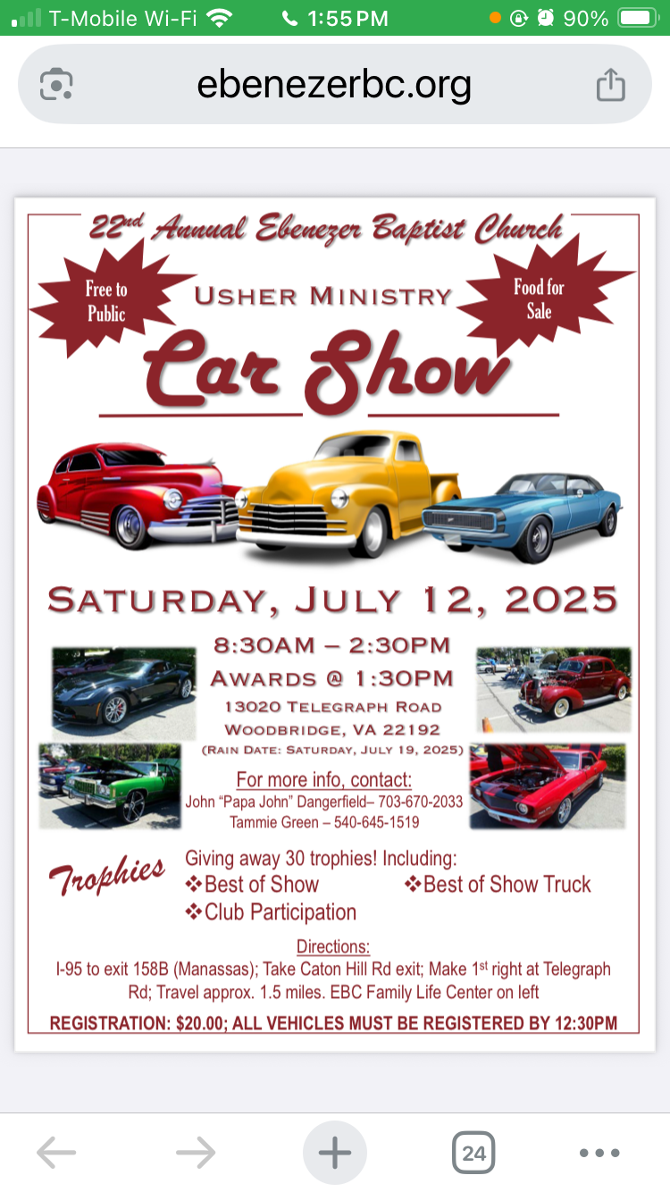 • public 1970-01-01 00:00:00 2025-07-12 14:30:00 America/Chicago 22nd Annual Ebenezer Baptist Church Usher Ministry Car Show 22nd Annual Ebenezer Baptist Church Usher Ministry Car Show will be held 7/12/2025 0830 AM to 7/12/2025 2:30 PM. Details online at: https://carshowradar.com/shows/va/22nd-annual-ebenezer-baptist-church-usher-ministry-car-show-2/. Woodbridge, Virginia