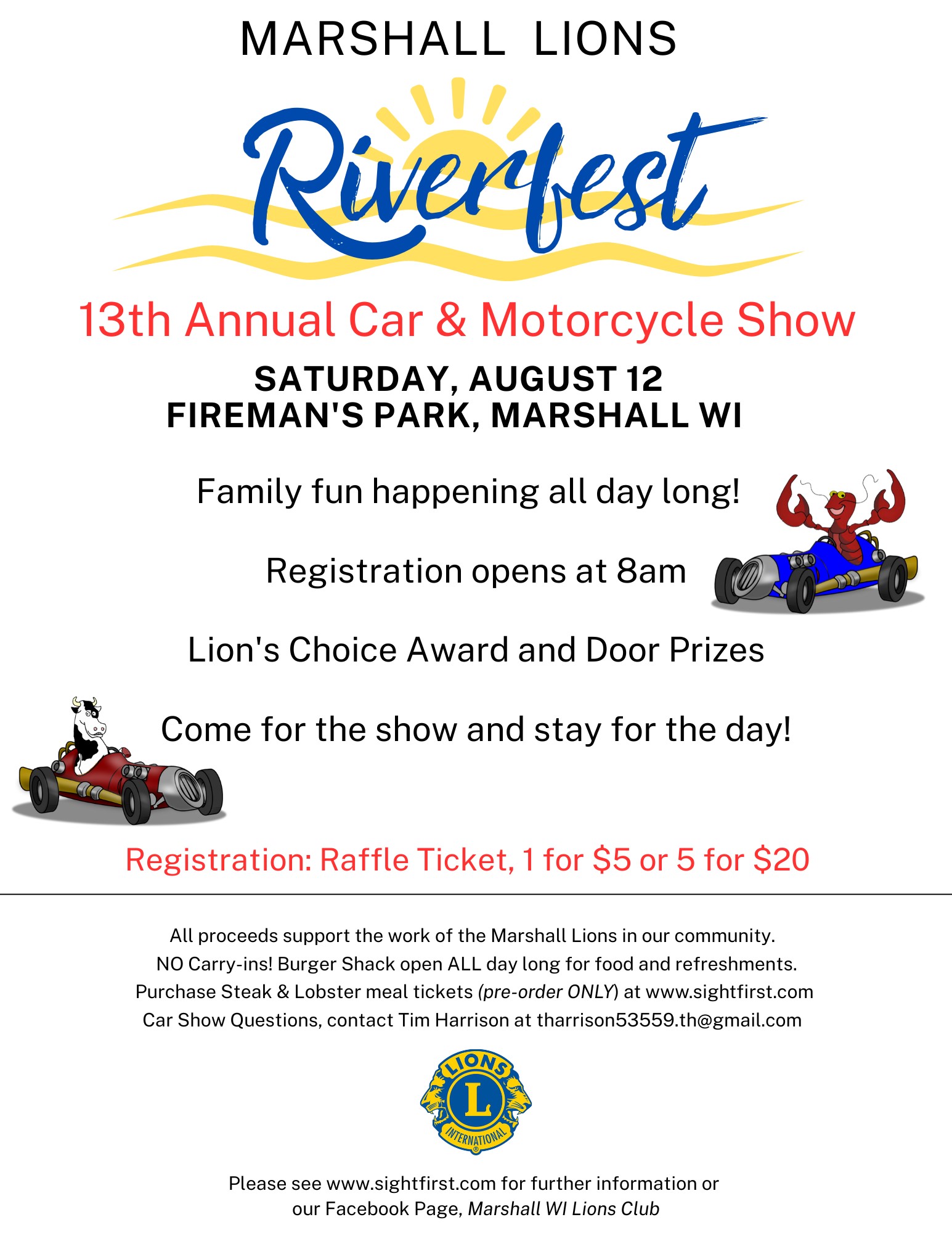 • public 2023-08-12 08:00:00 2023-08-12 15:00:00 America/Chicago Marshall Lions Car and Bike Show Marshall Lions Car and Bike Show will be held 8/12/2023 08:00 am to 8/12/2023 03:00 pm. Details online at: https://carshowradar.com/shows/wi/marshall-lions-car-and-bike-show/. Marshall, Wisconsin