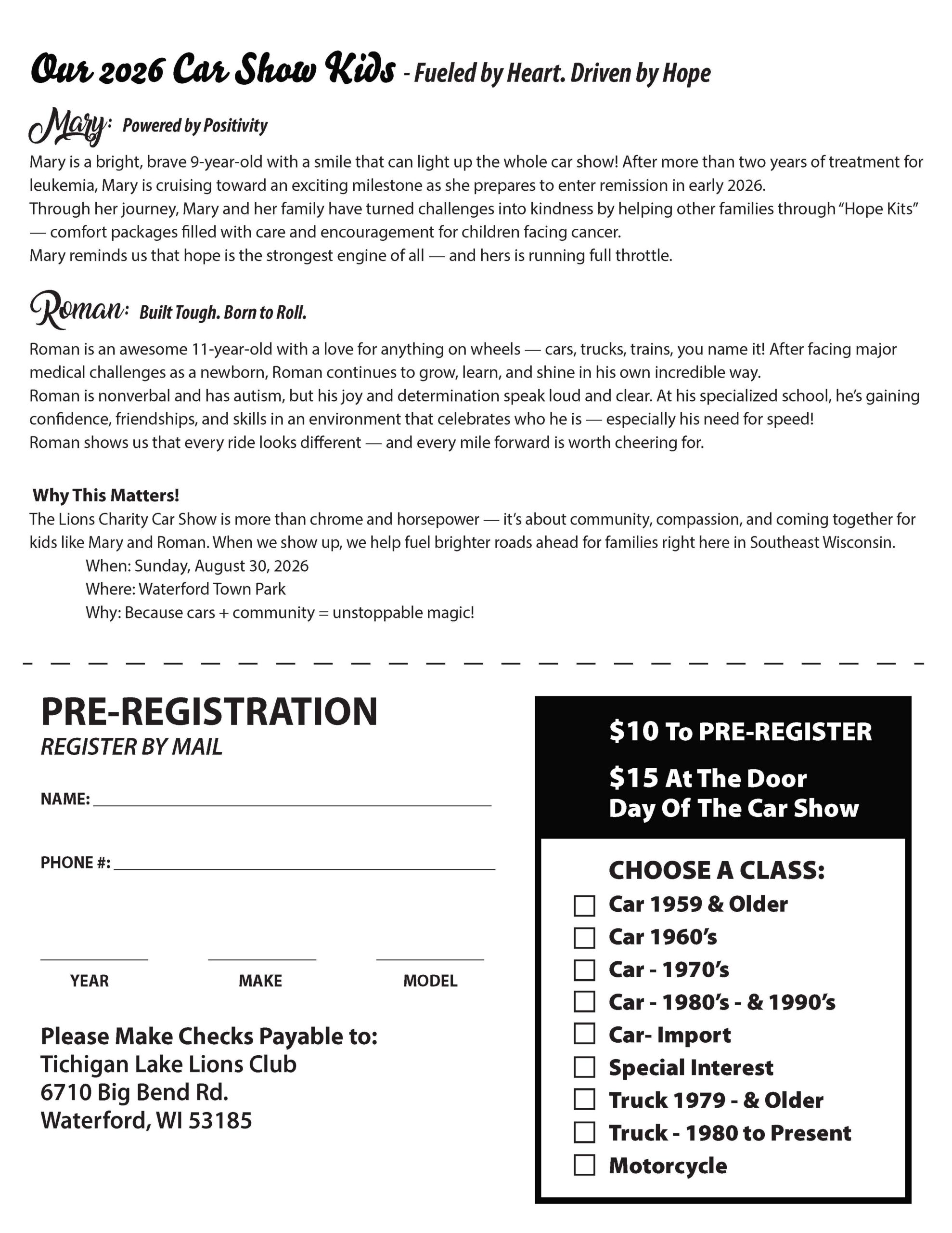 PRE-REGISTER TODAY: $10.00 – Save $$ – $15 Day of the Event https://www.lionscharitycarshow.com/register-your-vehicle